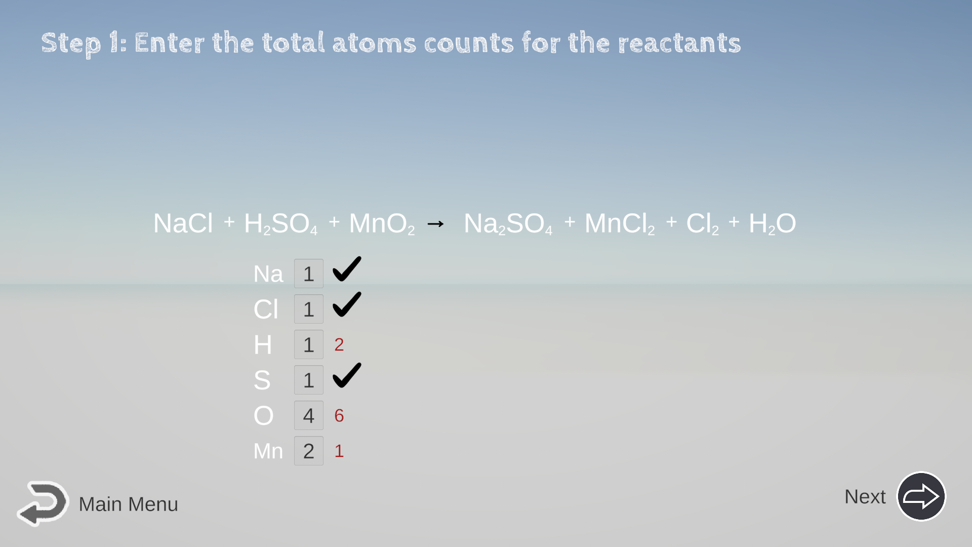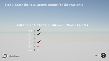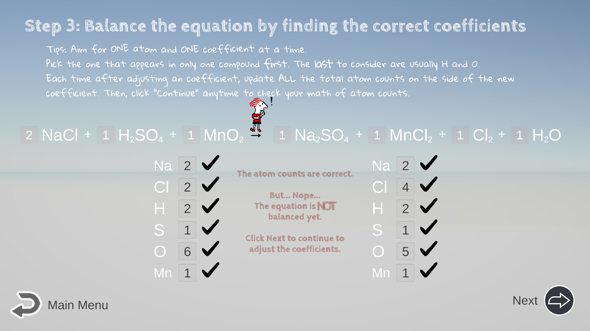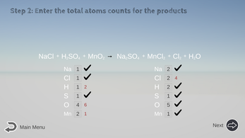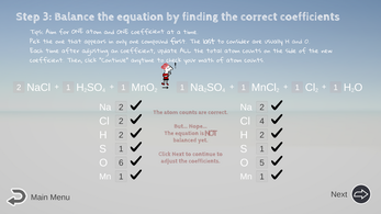 - Check Your Math: Click Next/Continue to let the computer check your math for to make sure all the math of the atom counts is correct so far. (Again, if you make a mistake on an atom count, it will affect your decision to correctly balance the equation.)