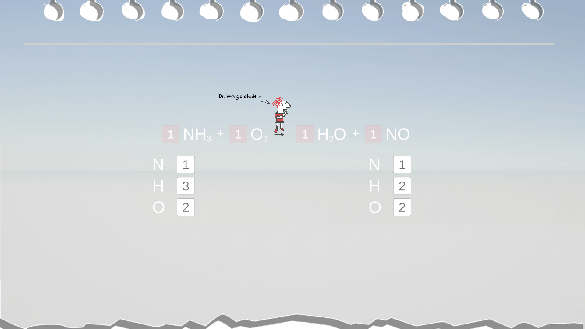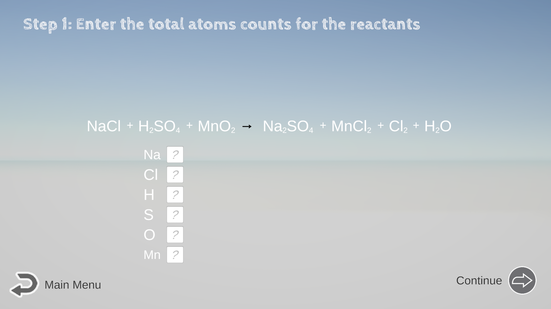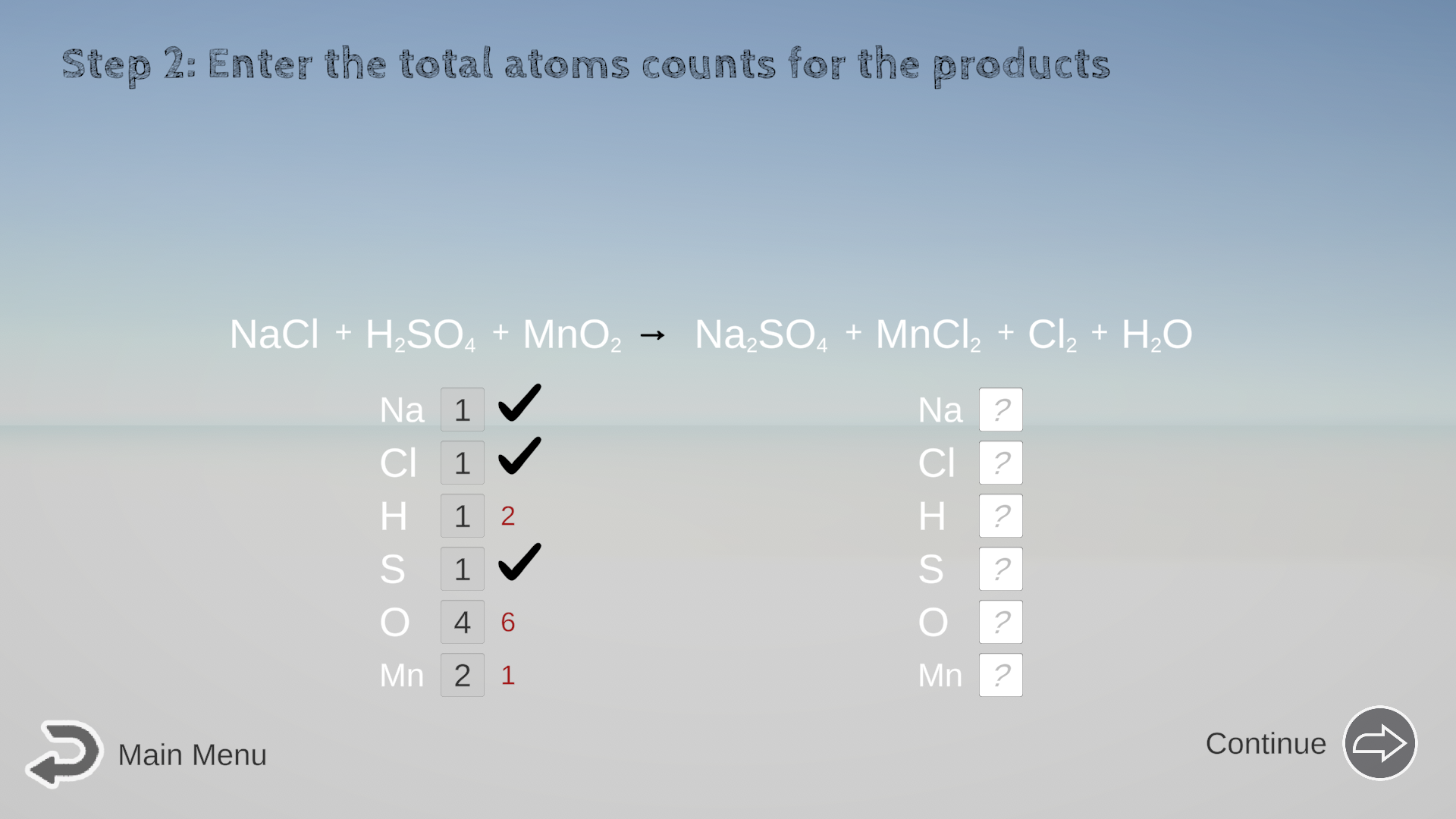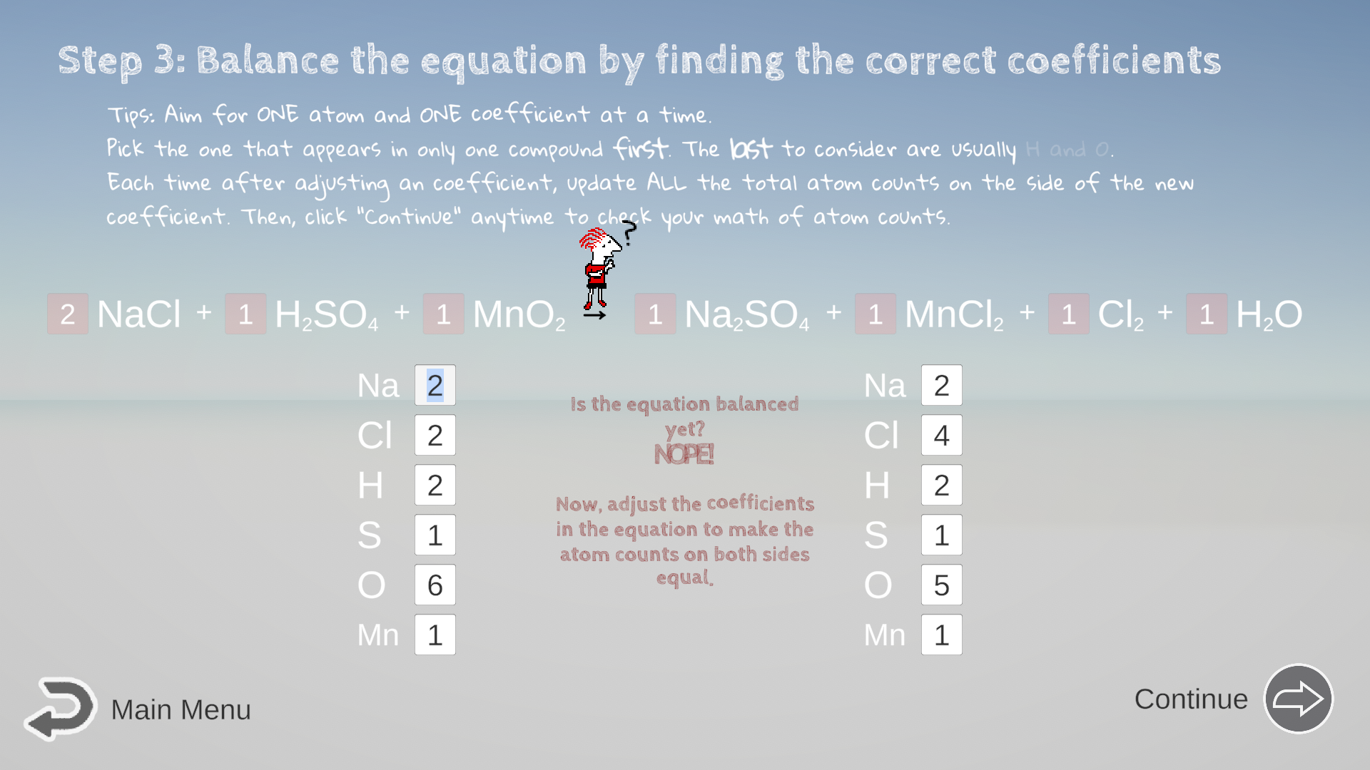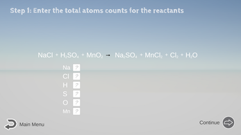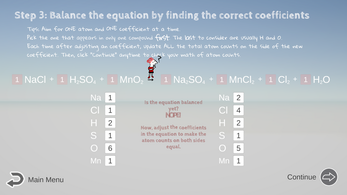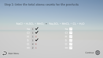 - Check your math of atom counts OFTEN: Feel free to click the Continue/Next button whenever you have adjusted anything, so you let the computer check your current math before moving on.