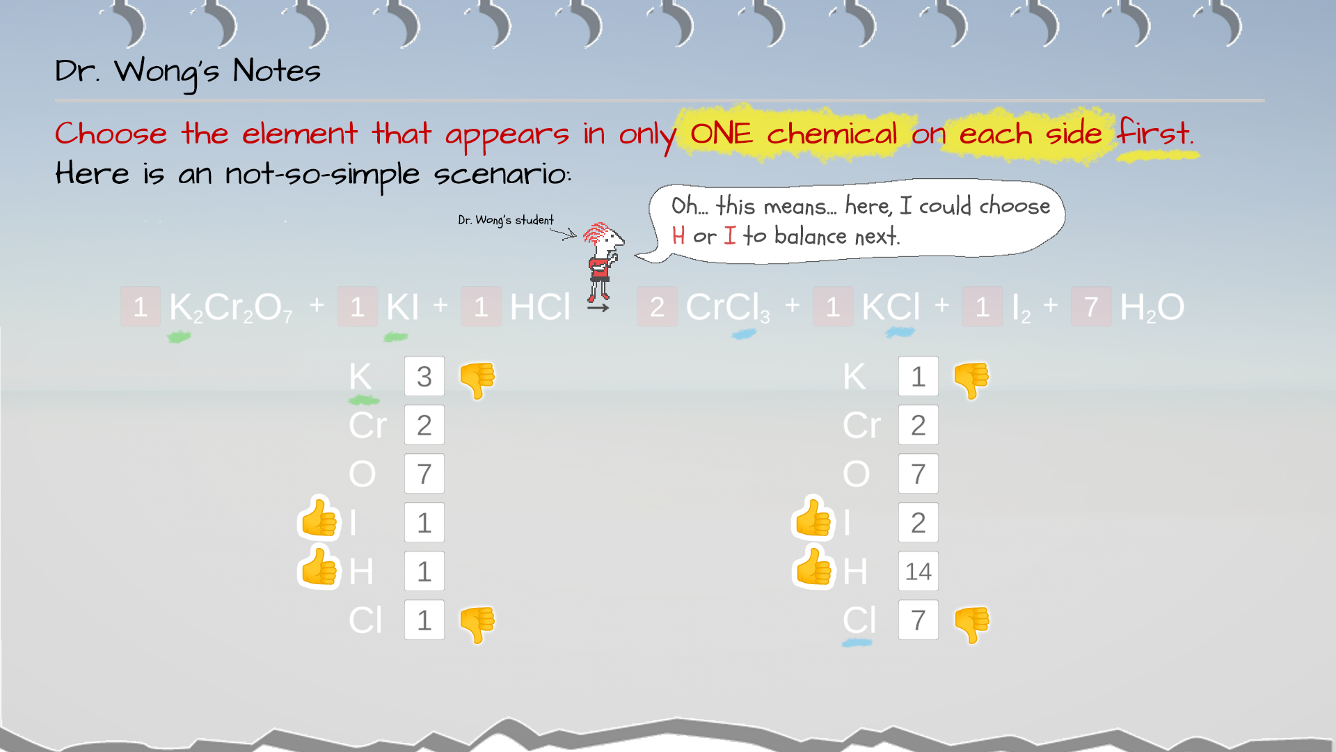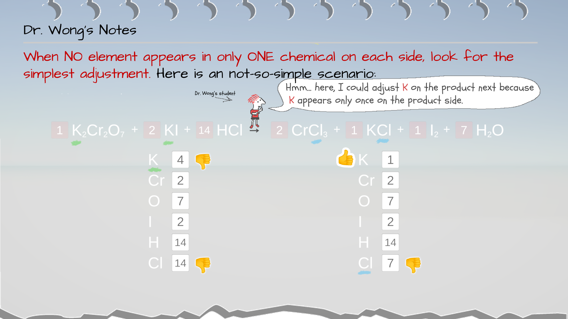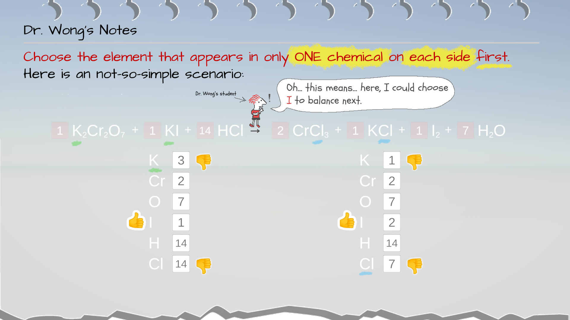 Therefore, for now, we eliminate K and Cl for what to balance next. You could choose from Cr, O, I, or H to balance next.