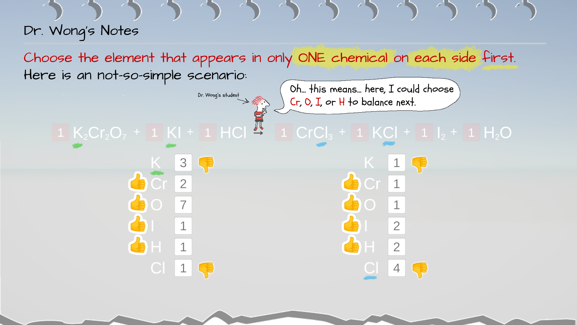 Example 3: In this scenario, Cr and O have been balanced. K, I, H, and Cl are not yet balance.
